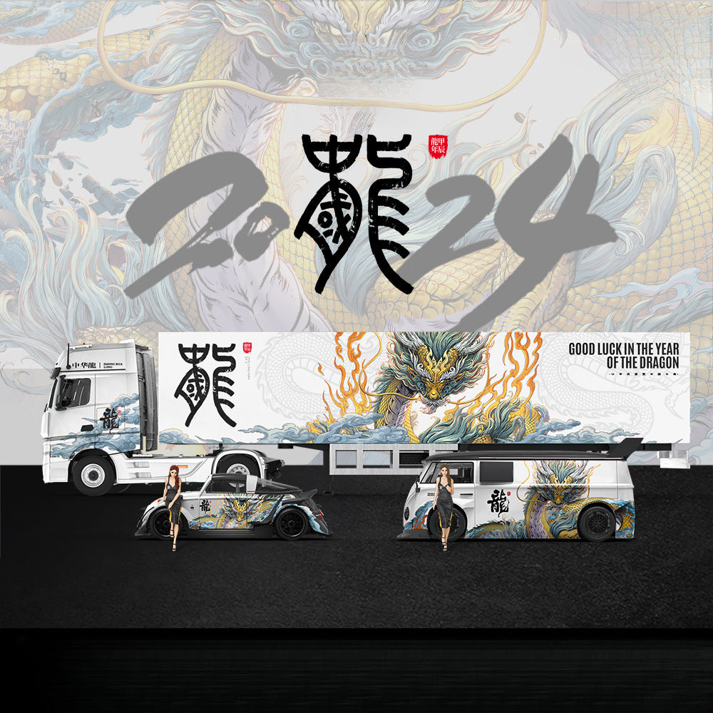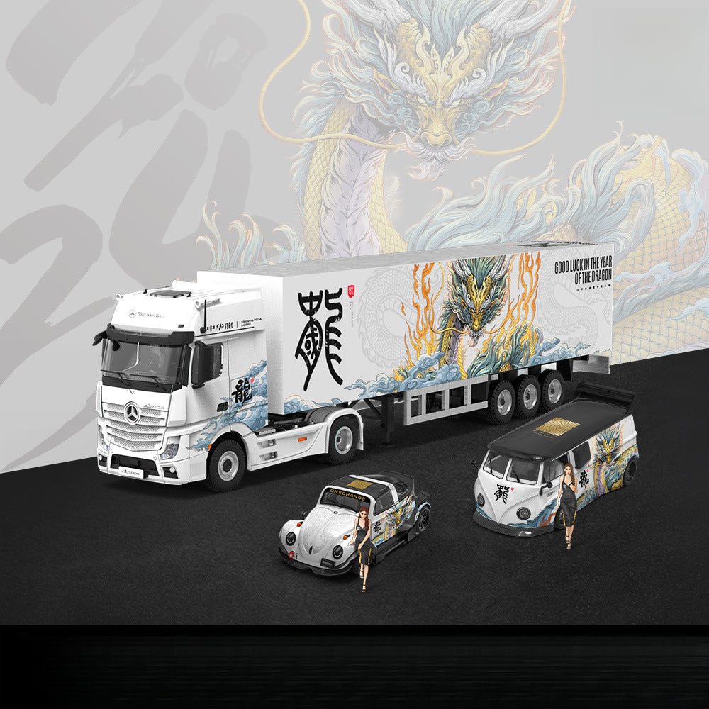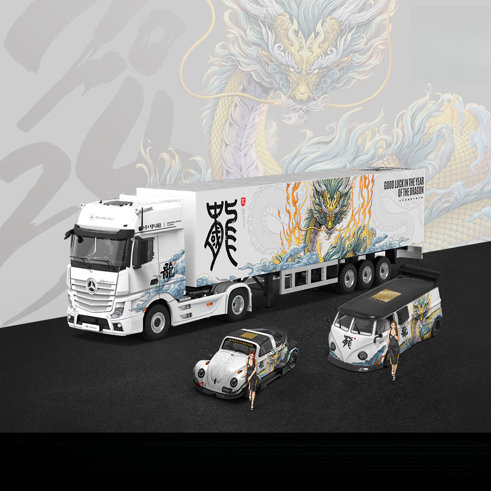 TheMODERNART 1:64 Chinese Dragon Seriesis a unique collection of diecast alloy car models,inspired by Chinese cultural elements and crafted with precision.FeaturingVolkswagen Van,Volkswagen Beetle, and theMercedes-Benz Actros Container Truck, each piece is an original design that blends automotive classics with artistic creativity.