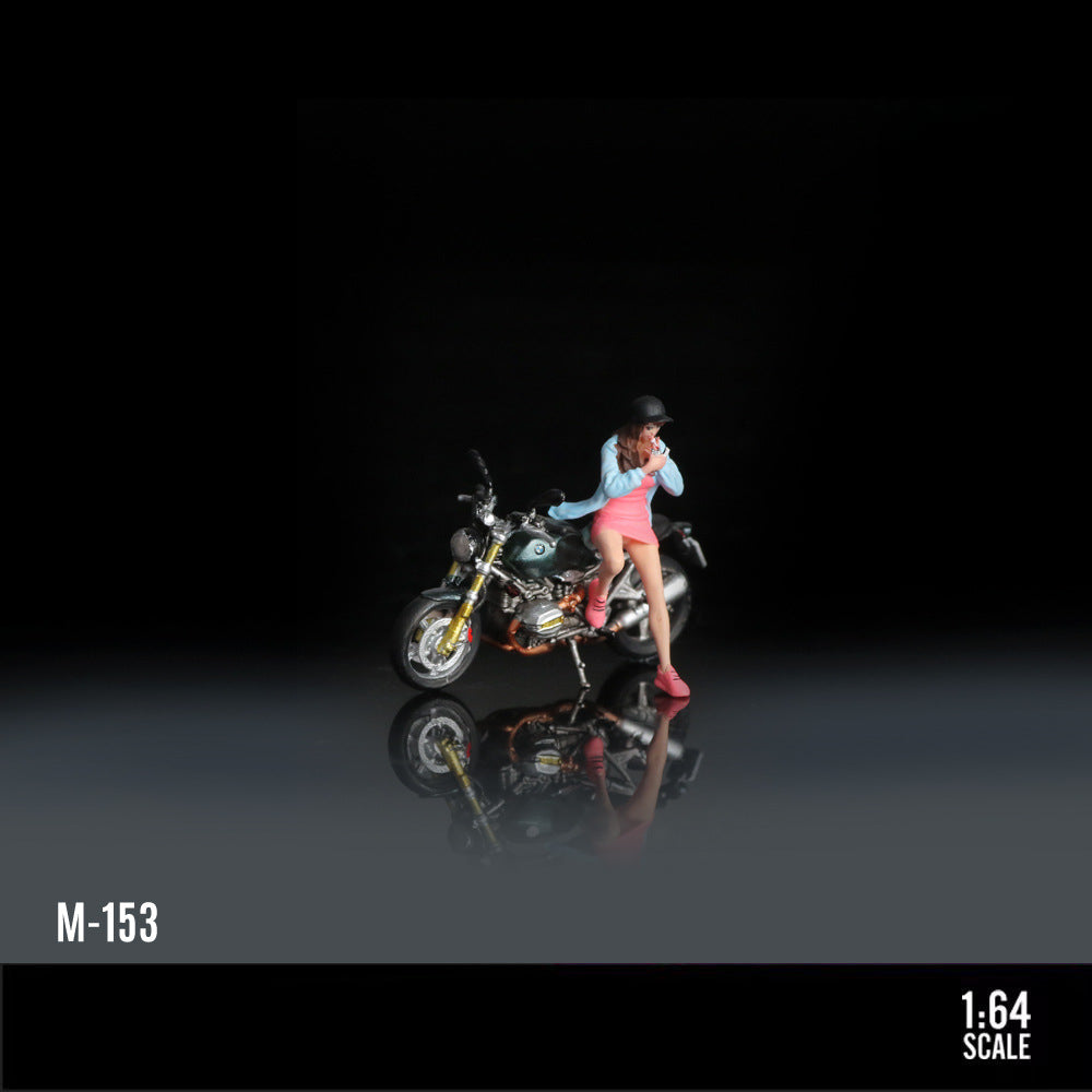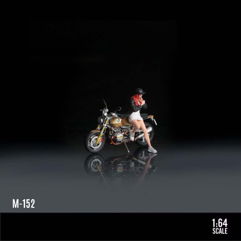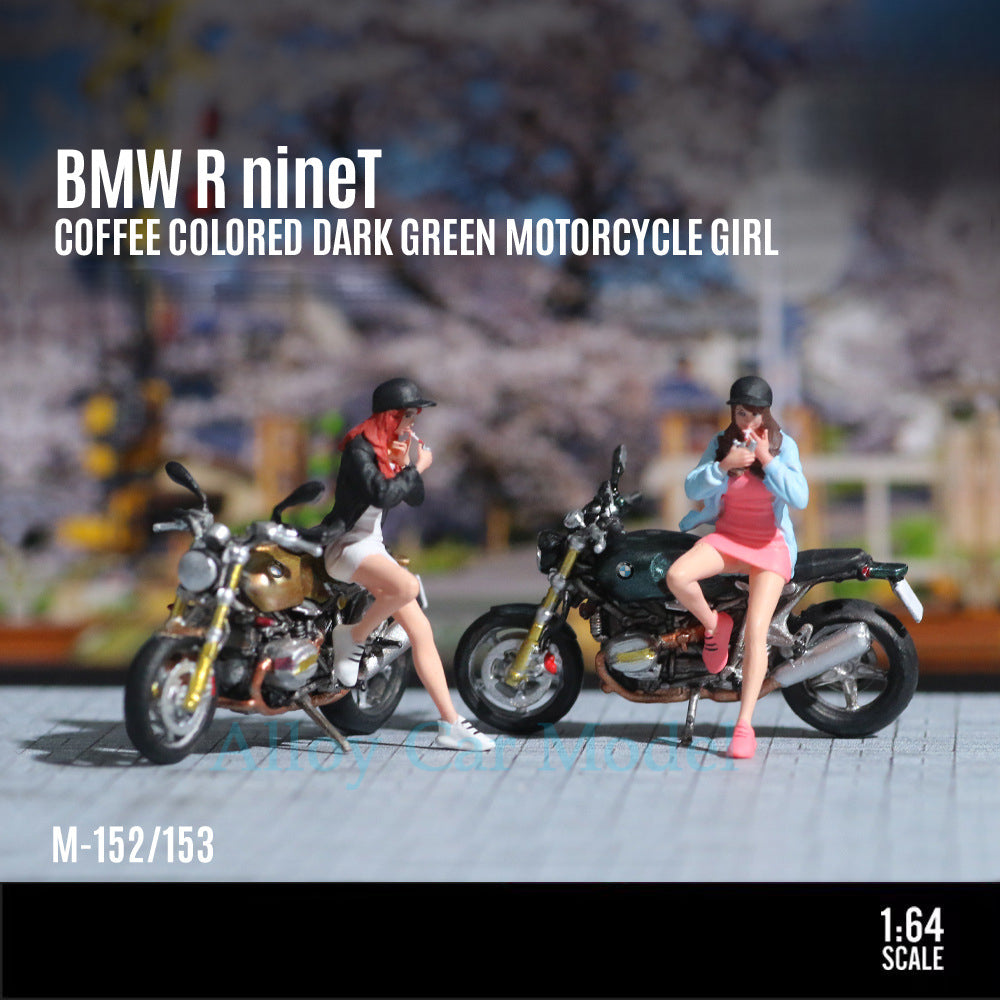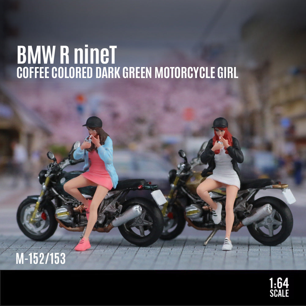 The MoreArt 1:64 BMW R nineT Brown& Green Motorcycle Girl is a finely detailed resin figure set, hand-painted with realistic features.Perfect for pairing with die-cast car models or displayed as a unique collectible.
