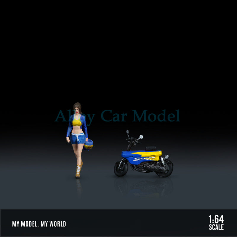 The MoreArt 1:64 Honda MOTO COMPO SPOON Themed Motorcycle Lady Figurine Set features finely handcrafted and hand-painted resin models, showcasing a stylish female rider paired with the iconic MOTO COMPO SPOON motorcycle.Perfect for collectors and enthusiasts seeking unique 1:64 scale display pieces.