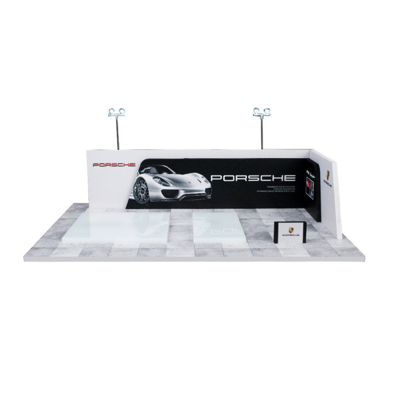 Crafted from high-quality PVC base, ABS sculpted supports, and acrylic cut panels, the scene creates an impressive display for1:64 scale Porsche diecast models or any other cars of similar scale.