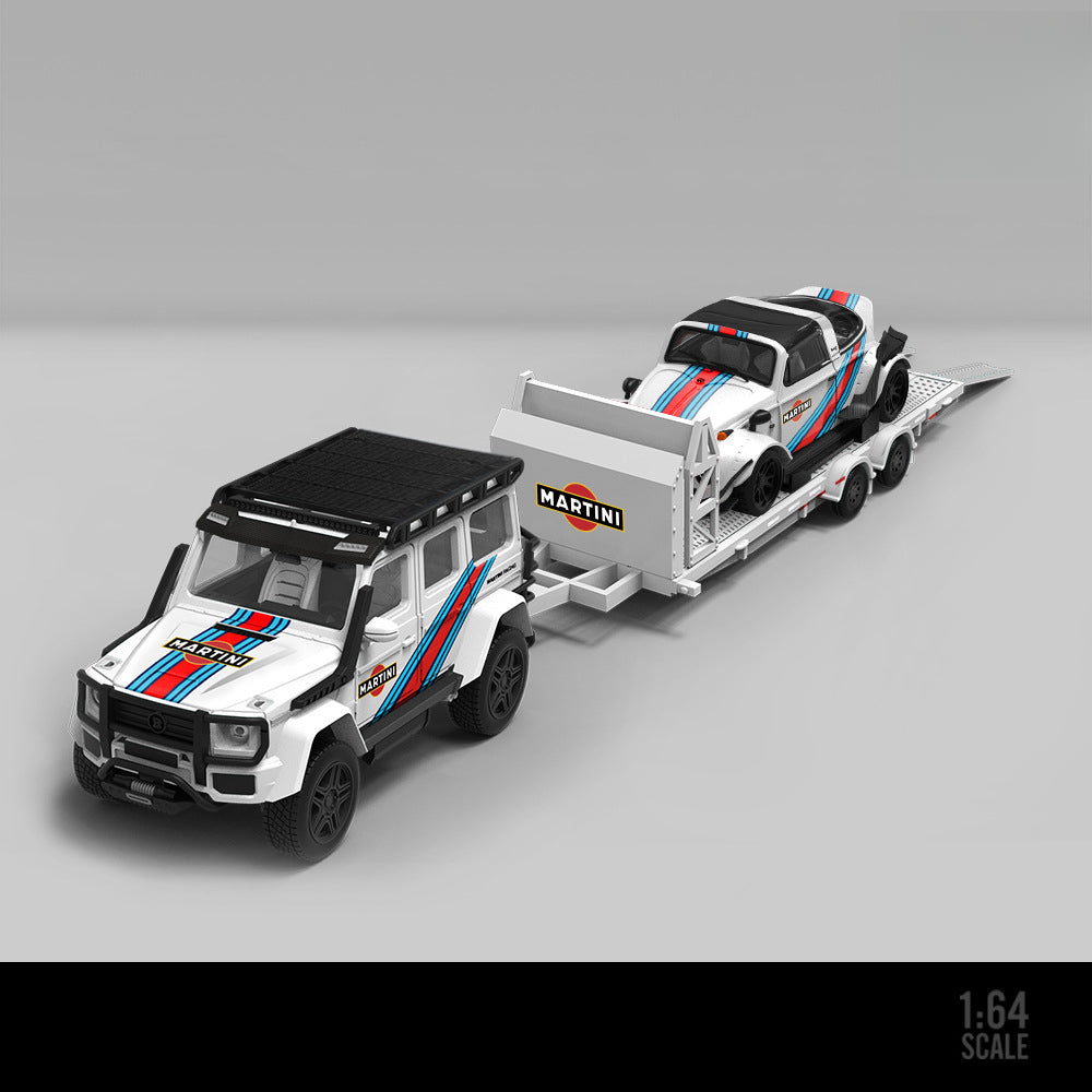 The TimeMicro 1:64 Martini Livery Trailer Set is a premium diecast car model collection featuring iconic Martini racing livery.Each vehicle has a sealed diecast metal body and chassis, perfect for collectors and display.