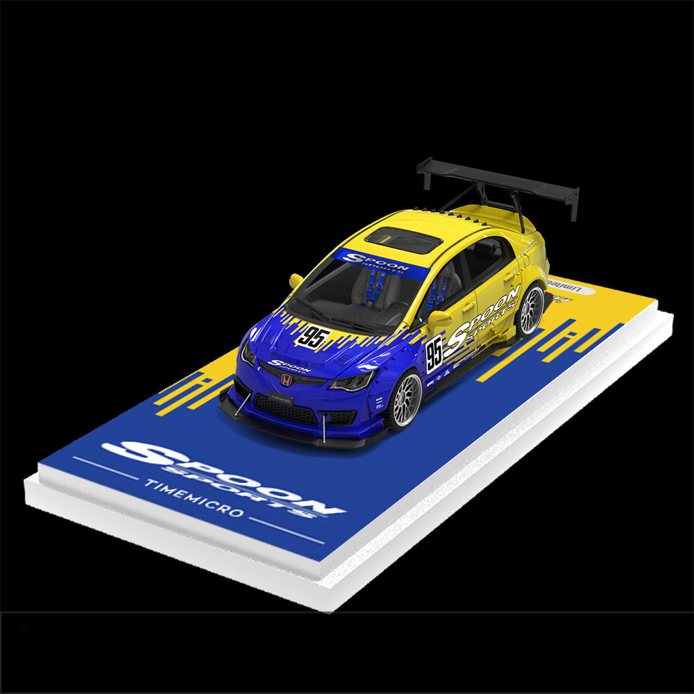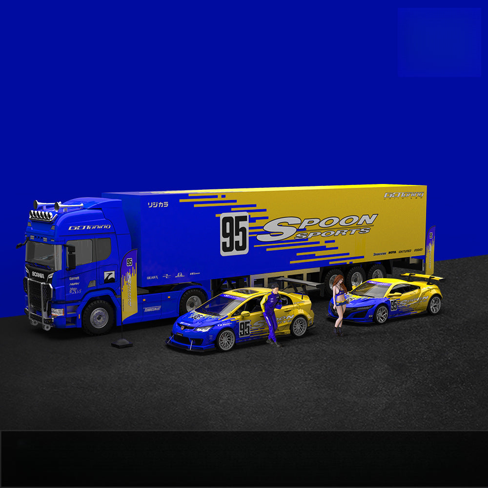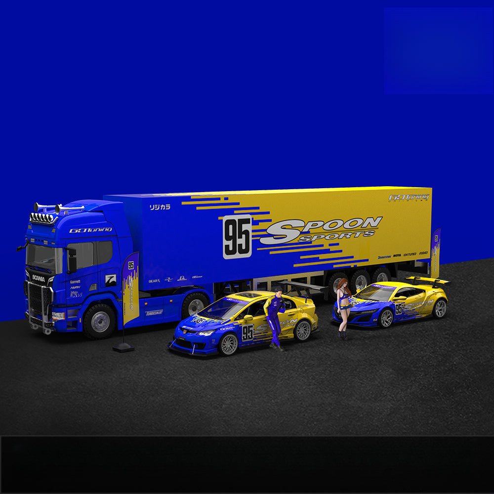TheTimeMicro1:64 Spoon Series Container Truck Setis a highly detailed diecast collectible that combines the iconic Spoon-modified Honda models with a realistic container hauler.Made withzinc alloy and ABS engineering plastic, the set includes two legendary Spoon cars (Civic and NSX) along with aFreightliner-style container truckfor an impressive display.