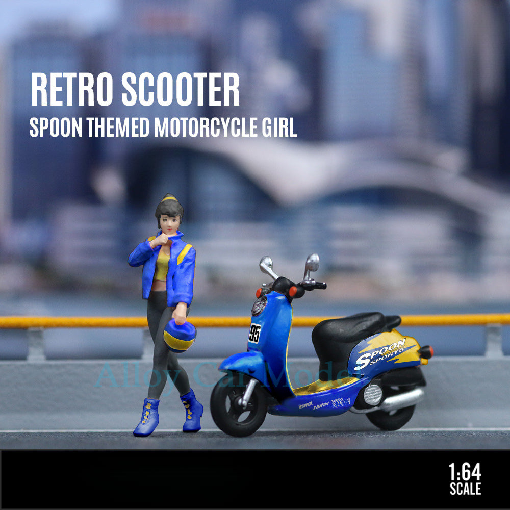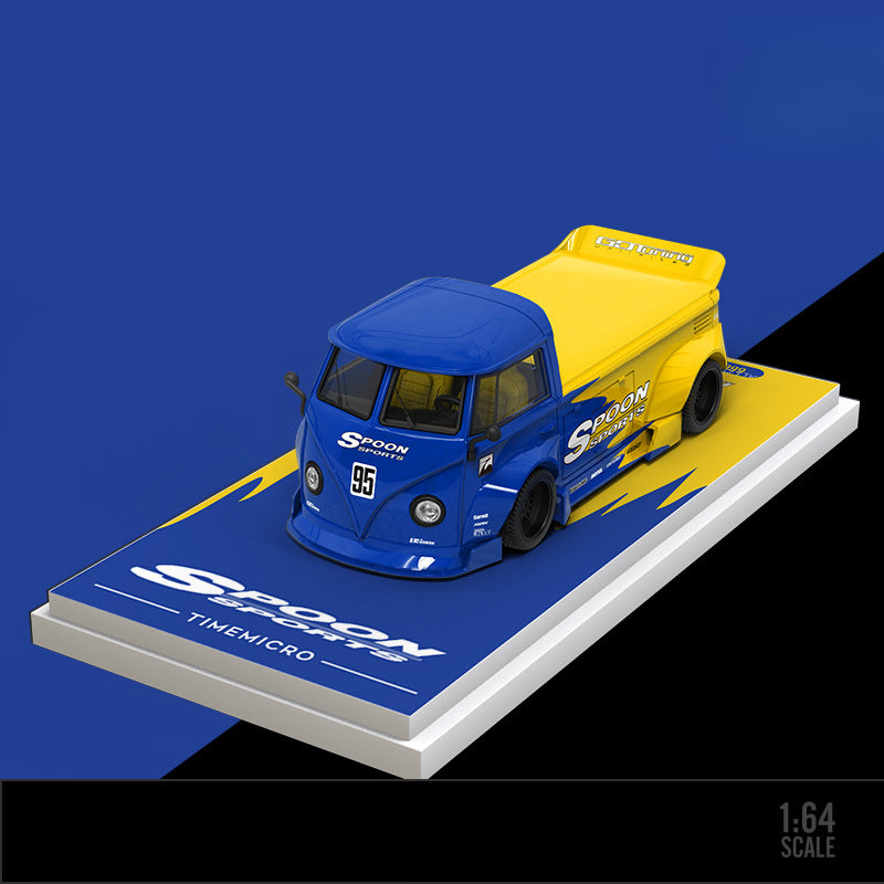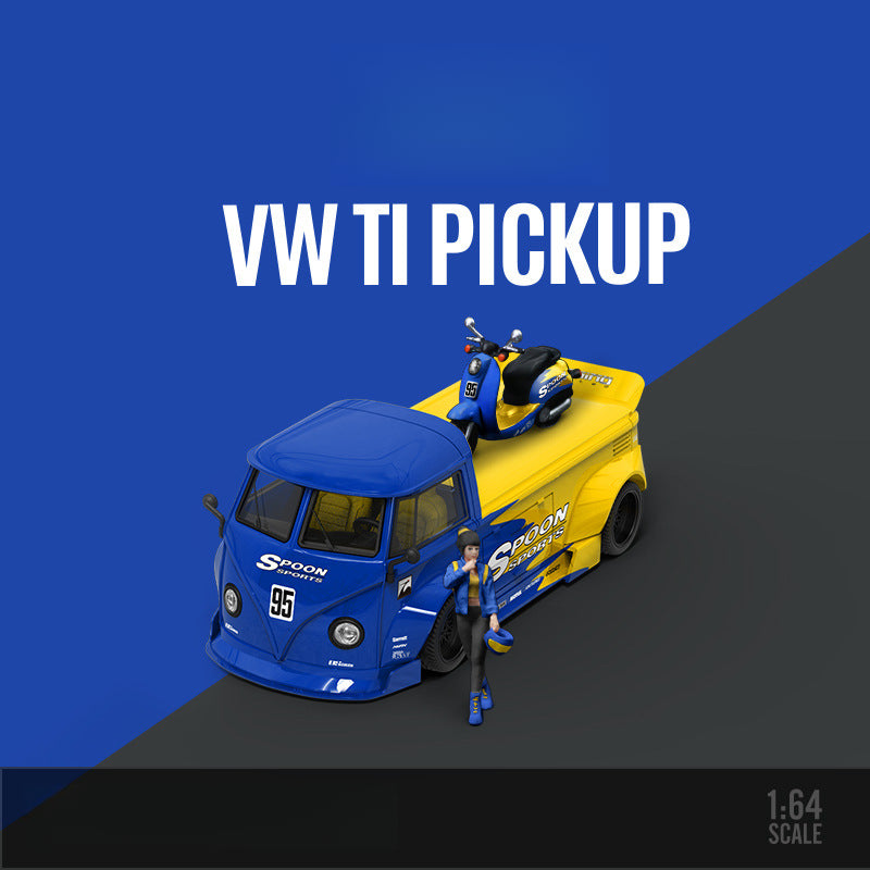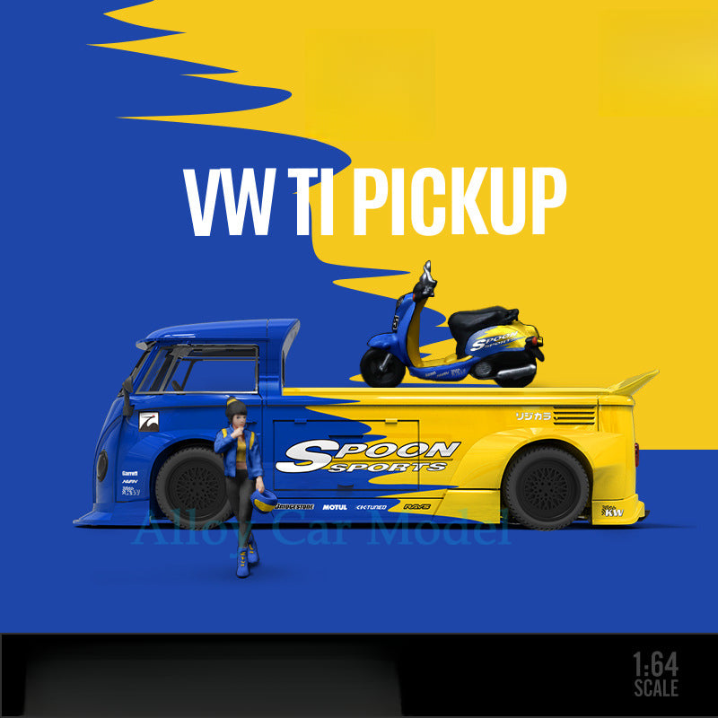 This TimeMicro& MoreArt1:64 SPOON Series combines a wide-body Volkswagen Pickup Van and a Racing Culture Motorcycle Girl Figure.The diecast van features a sealed metal body and chassis, while the scooter girl is a finely hand-painted resin collectible —perfect for pairing in themed dioramas or display with other car models.